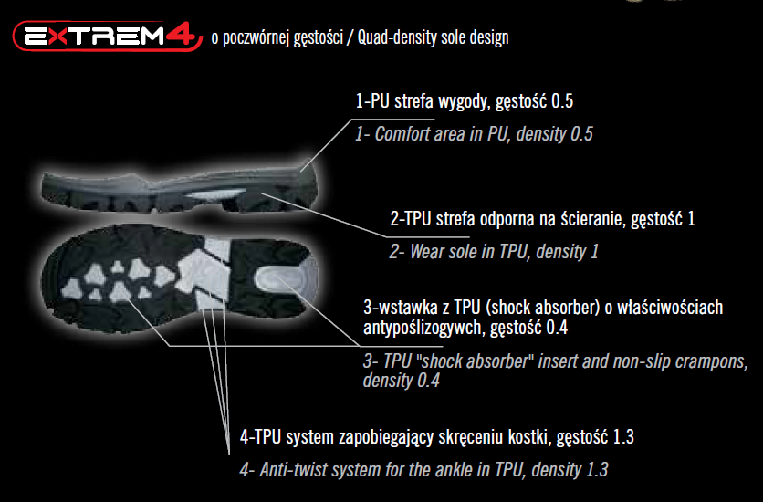Technologia EXTREM4 ® wykorzystuje wielostrefową budowę podeszwy, gdzie każda warstwa pełni określoną funkcję. Dzięki temu użytkownik otrzymuje optymalne połączenie komfortu, trwałości i bezpieczeństwa.